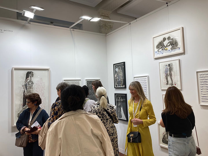 Bezoeker lopen langs de stand van Galerie Clement met werk van Sarah van der Pols.